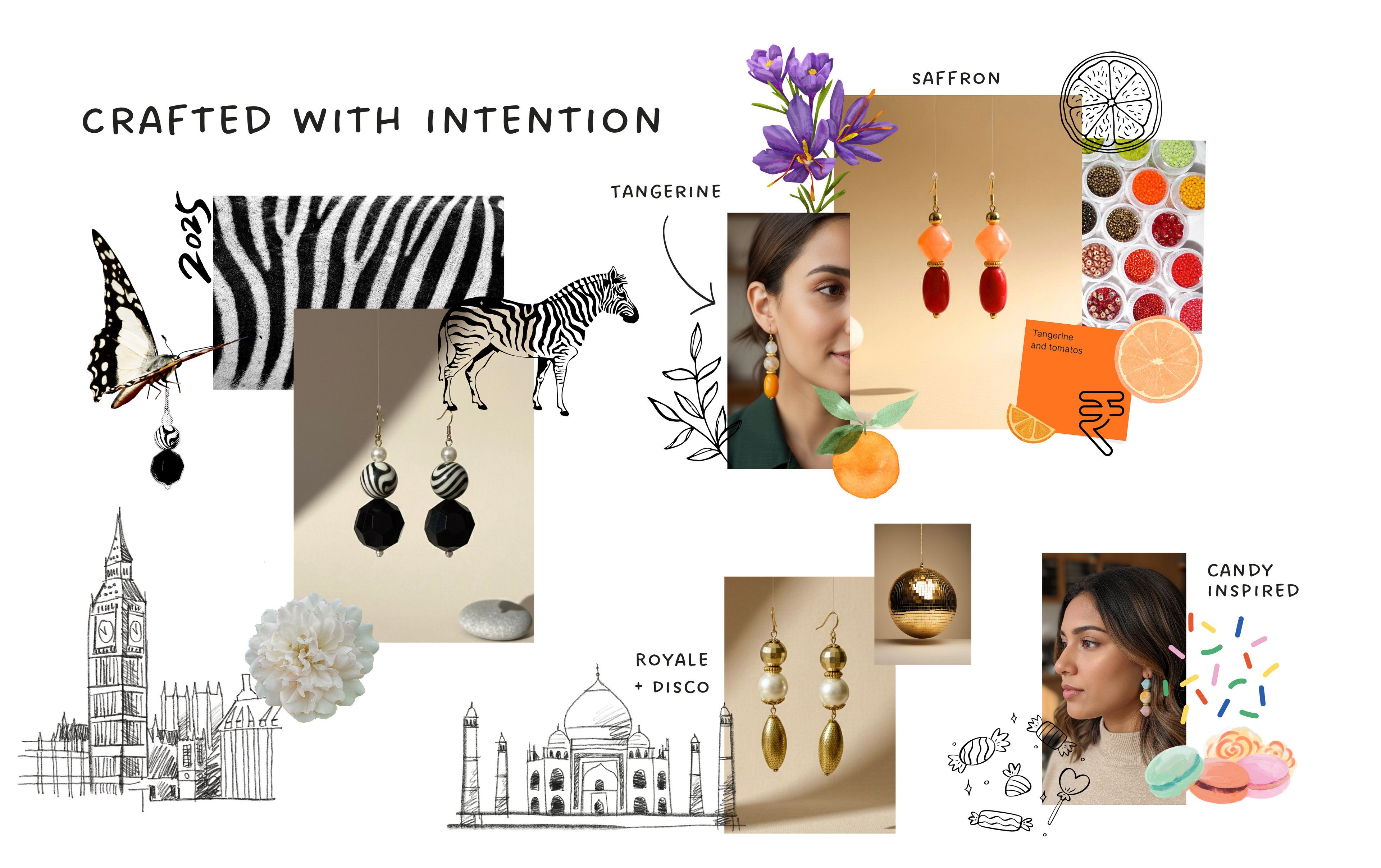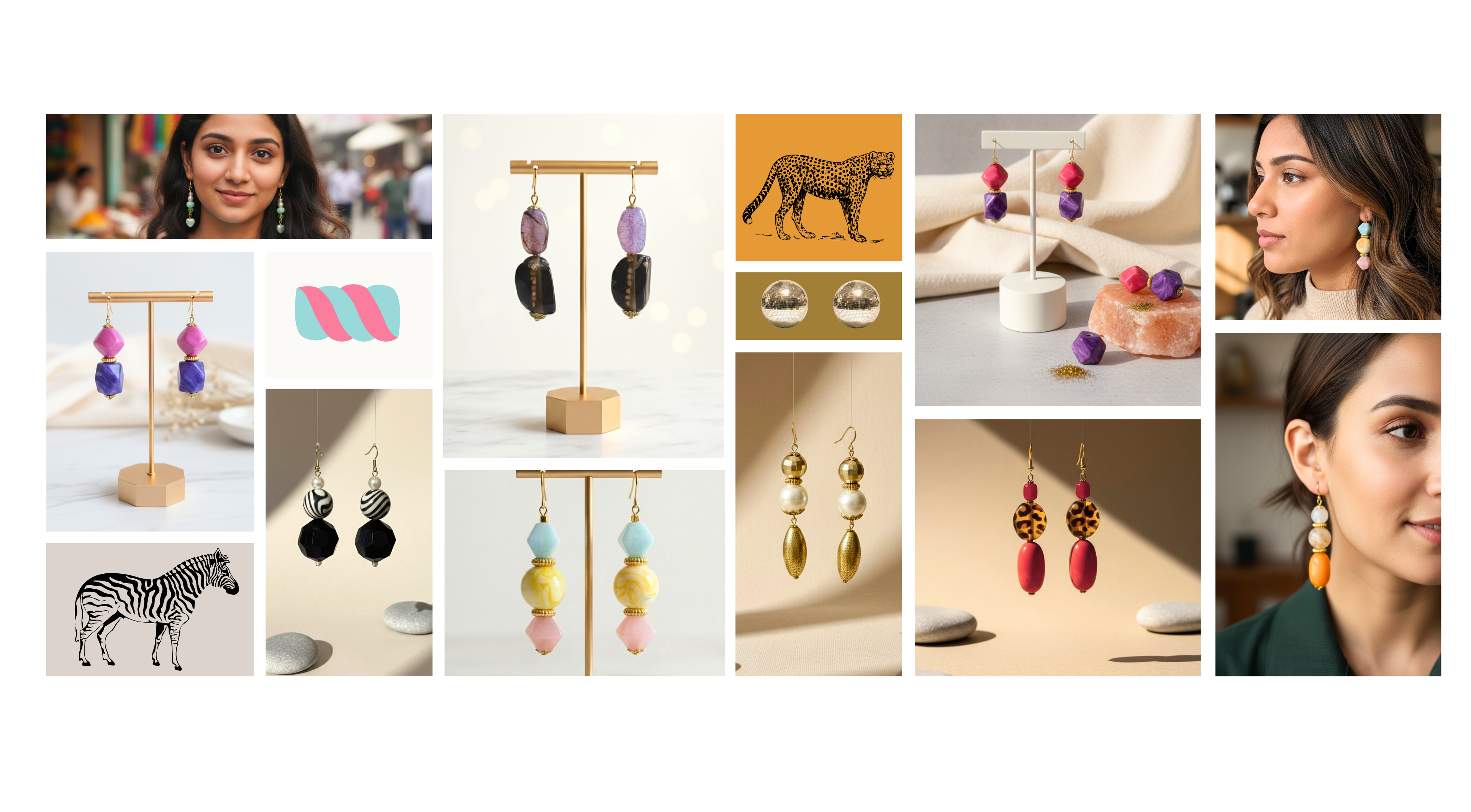Handcrafted earrings and accessories that carry sculptural forms, modern colour stories, and one-of-a-kind details.